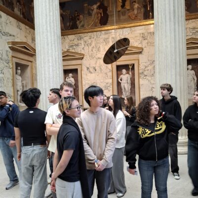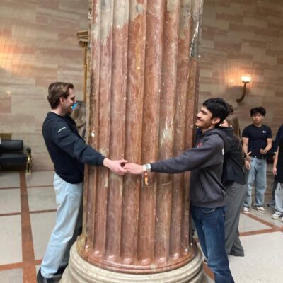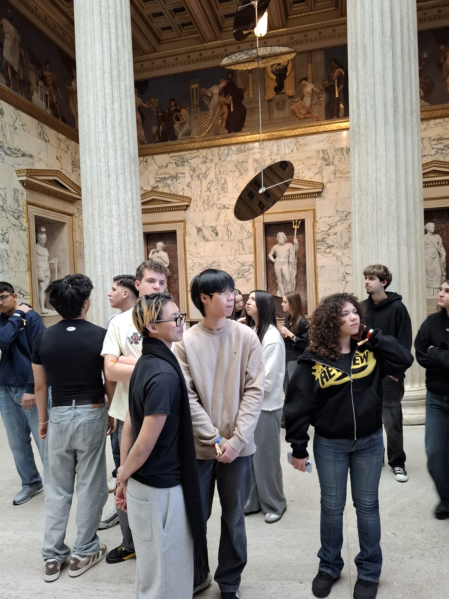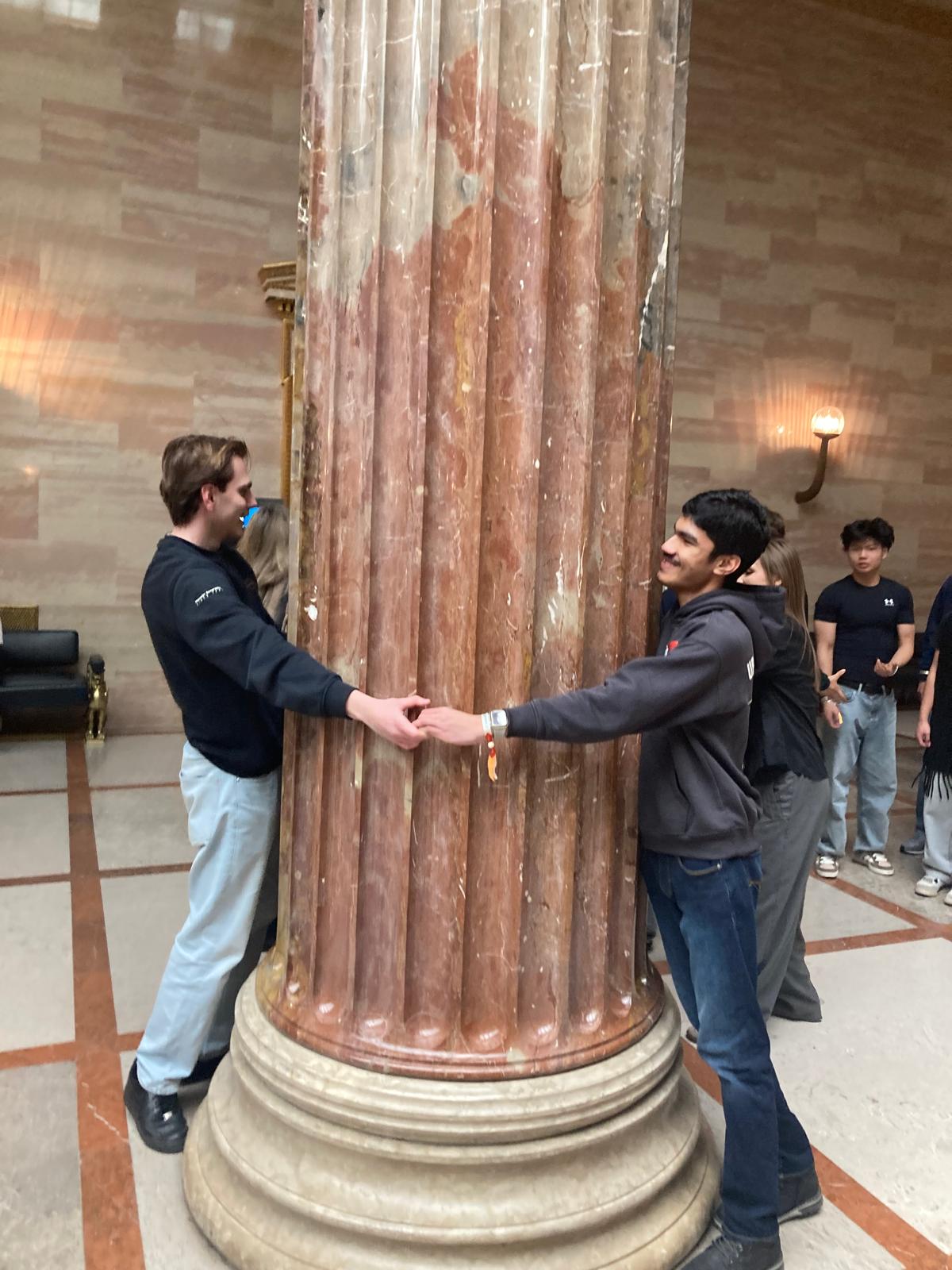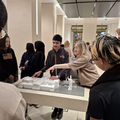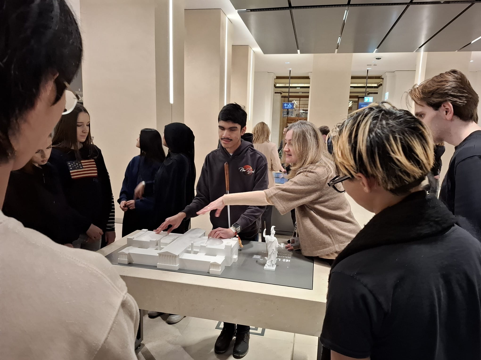 Im einem 85-minütigem Rundgang erlebten wir eine intensive und inklusive Spezialführung durch das erst kürzlich generalsanierte „Haus des Volkes“. Die versierte Vermittlerin erläuterte Geschichte und Funktion des Parlaments von seinen Anfängen bis heute. Besonderes Augenmerk wurde auf die Einbeziehung unseres blinden Schülers Amir gelegt. Er durfte ein Modell des Parlaments ertasten, Mitschüler*innen beschrieben für ihn kunstvolle Gemälde, die symbolisch die Idee der Demokratie darstellen. In der großen Säulenhalle erlebte er die enorme Dimension einer Marmorsäule, die er mit einem Mitschüler „umfassend begreifen“ durfte.