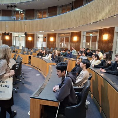 Nach genauen Eingangskontrollen warteten wir im Besucherzentrum, das zahlreiche interaktive Stationen mit interessanten Informationen zu Parlament, Demokratie und Abgeordneten bietet, auf unsere Vermittlerin.