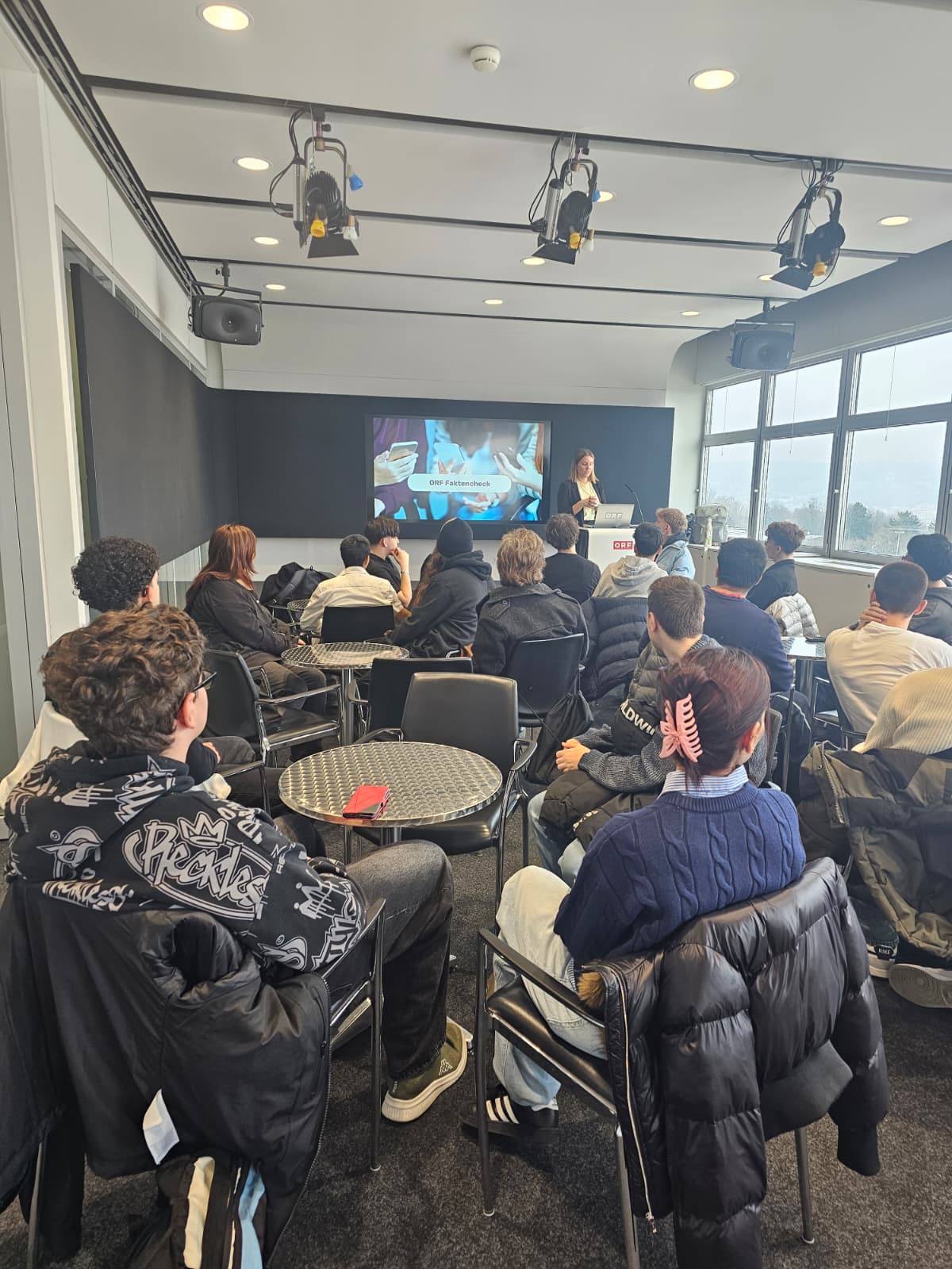 Zwischen Studios, Regieräumen und beeindruckend vielen Kameras und Scheinwerfern, die wir lieber nicht berührt haben, bekamen wir einen Blick hinter die Kulissen, den man sonst nur im Fernsehen sieht. Höhepunkt des Vormittags war der Workshop mit Kathrin Pollak, Moderatorin und Journalistin beim ORF. Sie zeigte uns, wie man Fakten checkt, Fake News entlarvt und warum guter Journalismus manchmal wie Detektivarbeit ist.